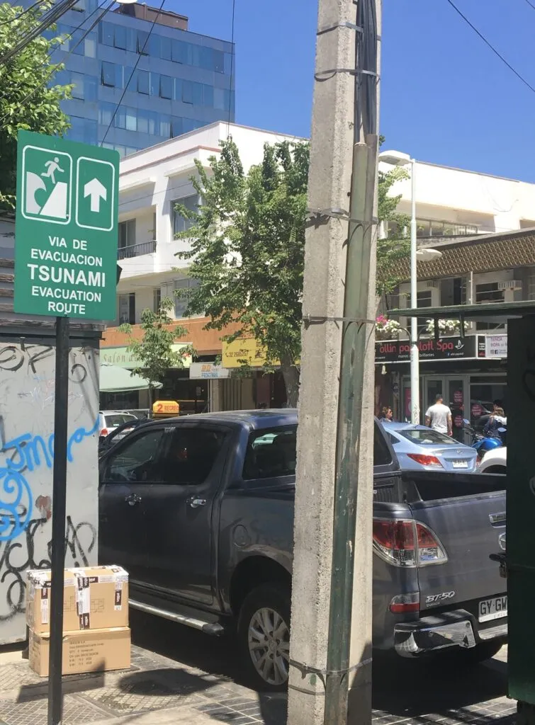 Um detalhe que nos chocou foi a quantidade de placas alertando sobre tsunamis na beira-mar. Essas sinalizações são um lembrete constante do poder imprevisível do oceano Pacífico e fomos sentindo este poder em toda a parte costeira da viagem.