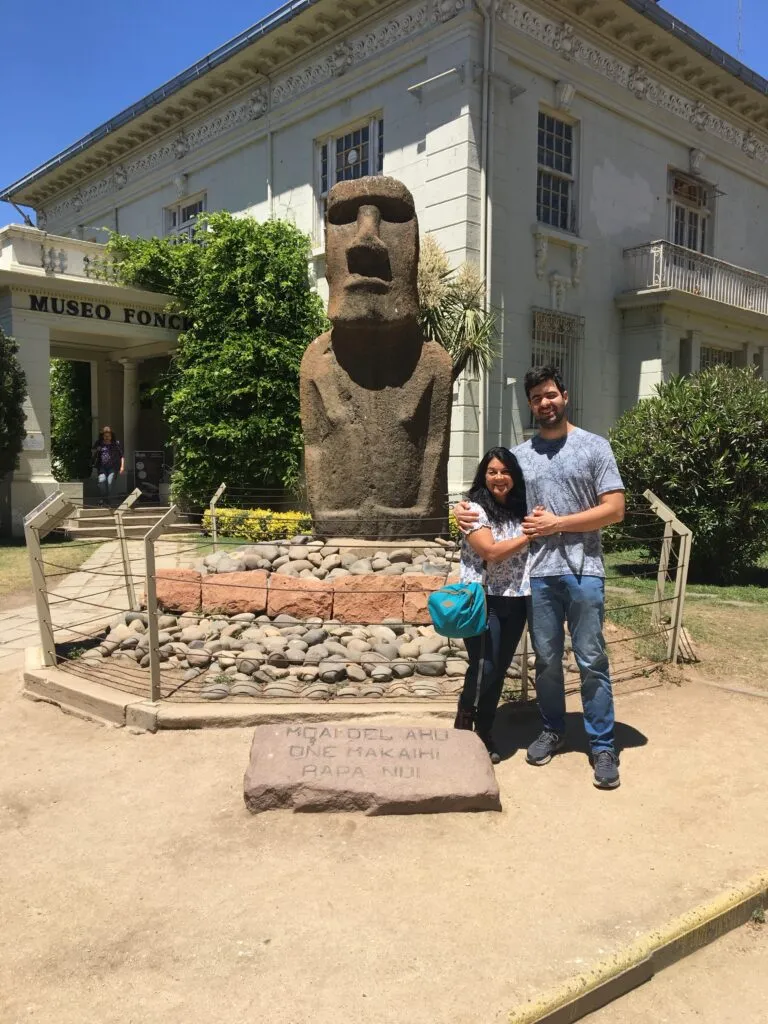 Em Viña del Mar , visitamos o Museu Arqueológico Fonck , que exibe um Moai da Ilha de Páscoa logo na entrada. Foi impressionante ver de perto essa peça histórica tão misteriosa. E para finalizar o dia, fomos para orla e contemplar o famoso pôr do sol de Viña del Mar , uma cena inesquecível com o céu tingido de laranja.