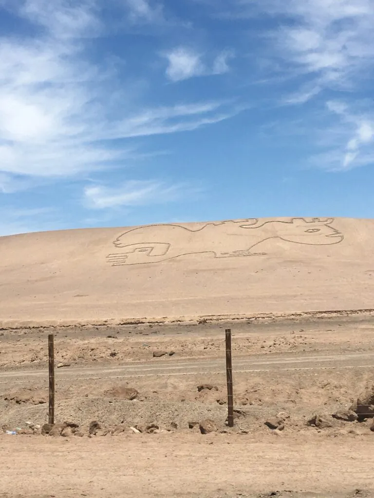 Retomando a viagem pela Rodovia Panamericana , fomos surpreendidos por um enorme geoglifo na encosta de uma montanha. A obra, chamada “Sueño y Esperanza” , foi criada em 1993 e o geoglifo é tão grande que pode ser visto de longe, criando um contraste impressionante com o vazio do deserto . Paramos para admirar essa obra de arte ao ar livre , sentindo a energia do lugar .