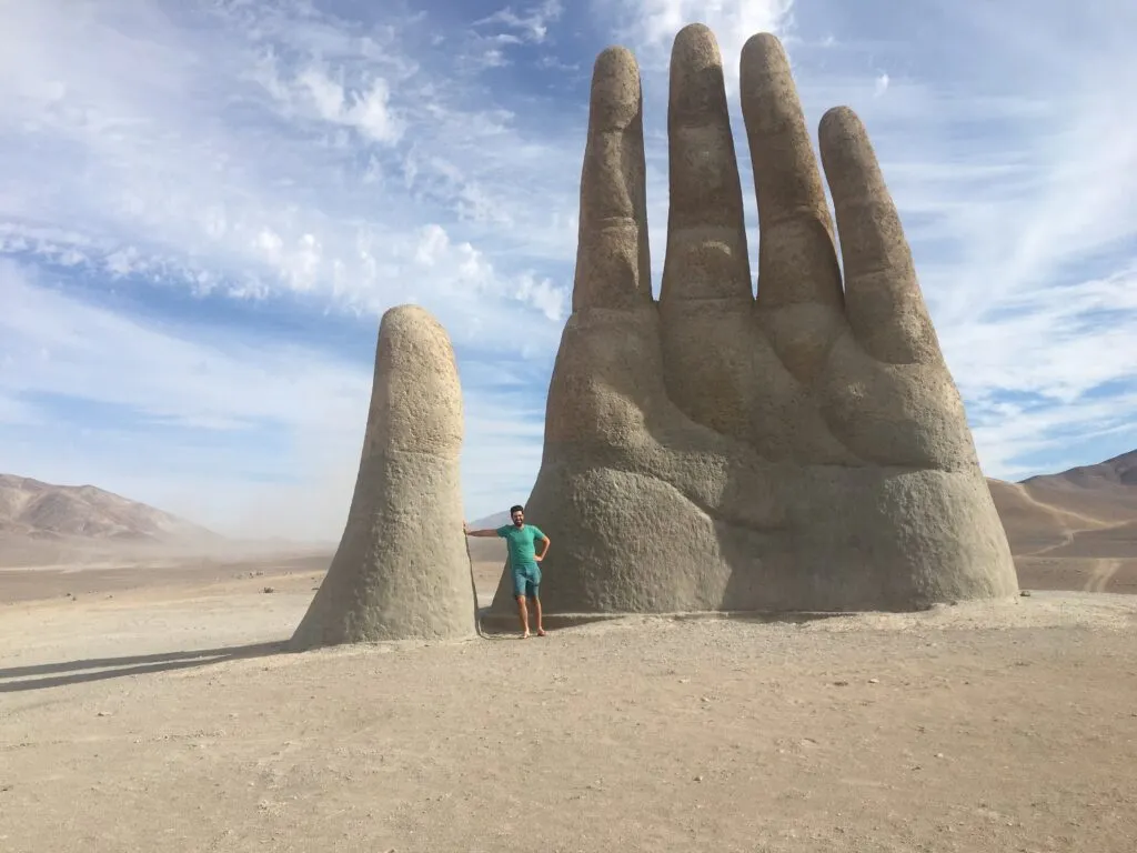 Mas na volta para Santiago, fomos conhecer o Mano del Desierto , uma escultura surreal no meio do deserto, criada pelo artista Mario Irarrázabal . A mão gigante surgiu do chão árido, como se estivesse tentando escapar das profundezas da terra.